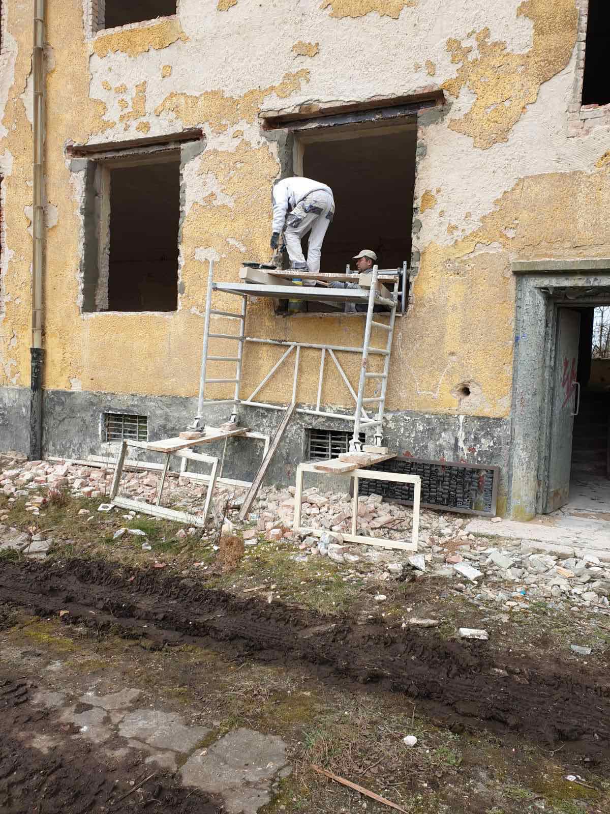 Берлін. Вибити та демонтувати 150 металевих перемичок з вікон (з двох сторін). Встановити 150 нових бетонних перемичок 2 DF (1,80 x 0,115 х 0,13 м). Встановити опалубку навколо перемичок, залити бетоном (товщина шару 3 см). Після висихання демонтувати опалубку.